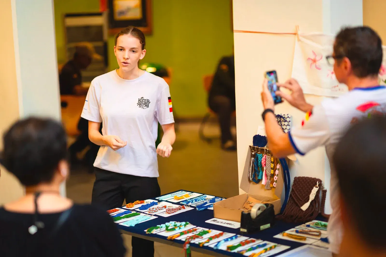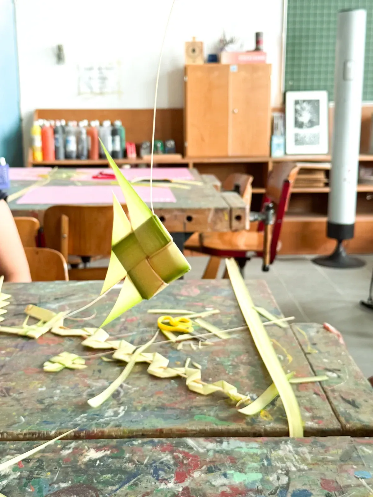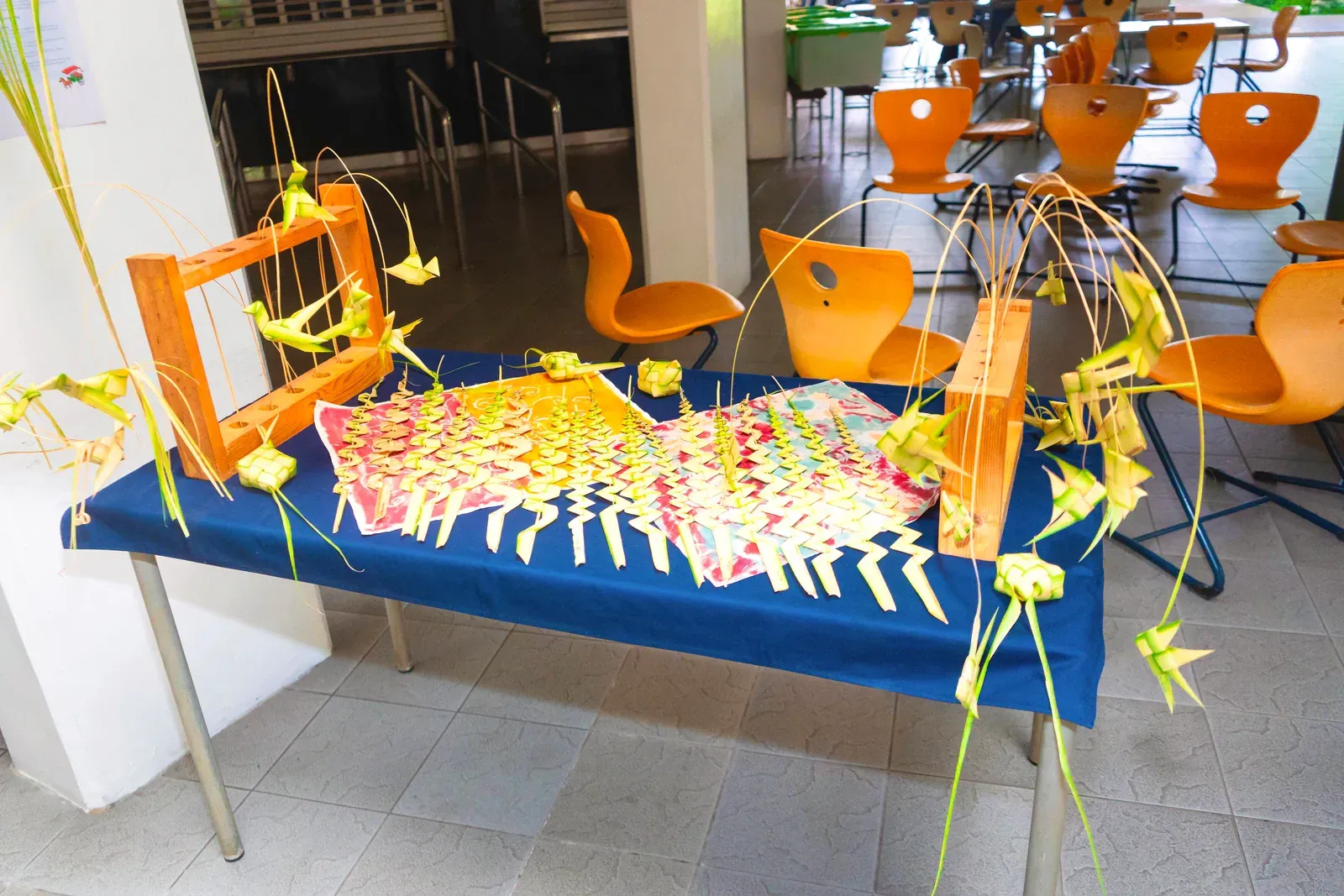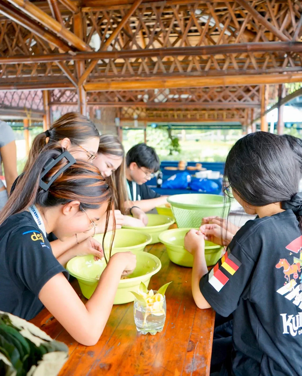 Nachdem die finalen Workshops abgeschlossen waren, verlagerte sich der Fokus darauf, die Aula und das Foyer in einen Ausstellungsraum zu verwandeln, der die Ergebnisse der vergangenen Tage präsentiert. Schülerinnen und Schüler sowie Lehrkräfte brachten den Raum zum Leben und stellten ihre Arbeiten vor – von filigranen Web- und Faltarbeiten bis hin zu experimentellen Projekten wie Kunst mit Tempeh und Camera-Obscura-Installationen, die jeweils Kreativität, Prozess und lokale Kulturen widerspiegelten. Natürliche Materialien wie Bambus und Rattan schufen dabei in vielen Arbeiten eine starke regionale Verbindung. Die Ausstellung wurde durch einen geführten Rundgang eröffnet, geleitet von unserer DSJ-Kunstlehrerin Chiara Giardi, die mit den Teams ins Gespräch kam und Einblicke in die Ideen und Techniken hinter ihren Arbeiten gab.