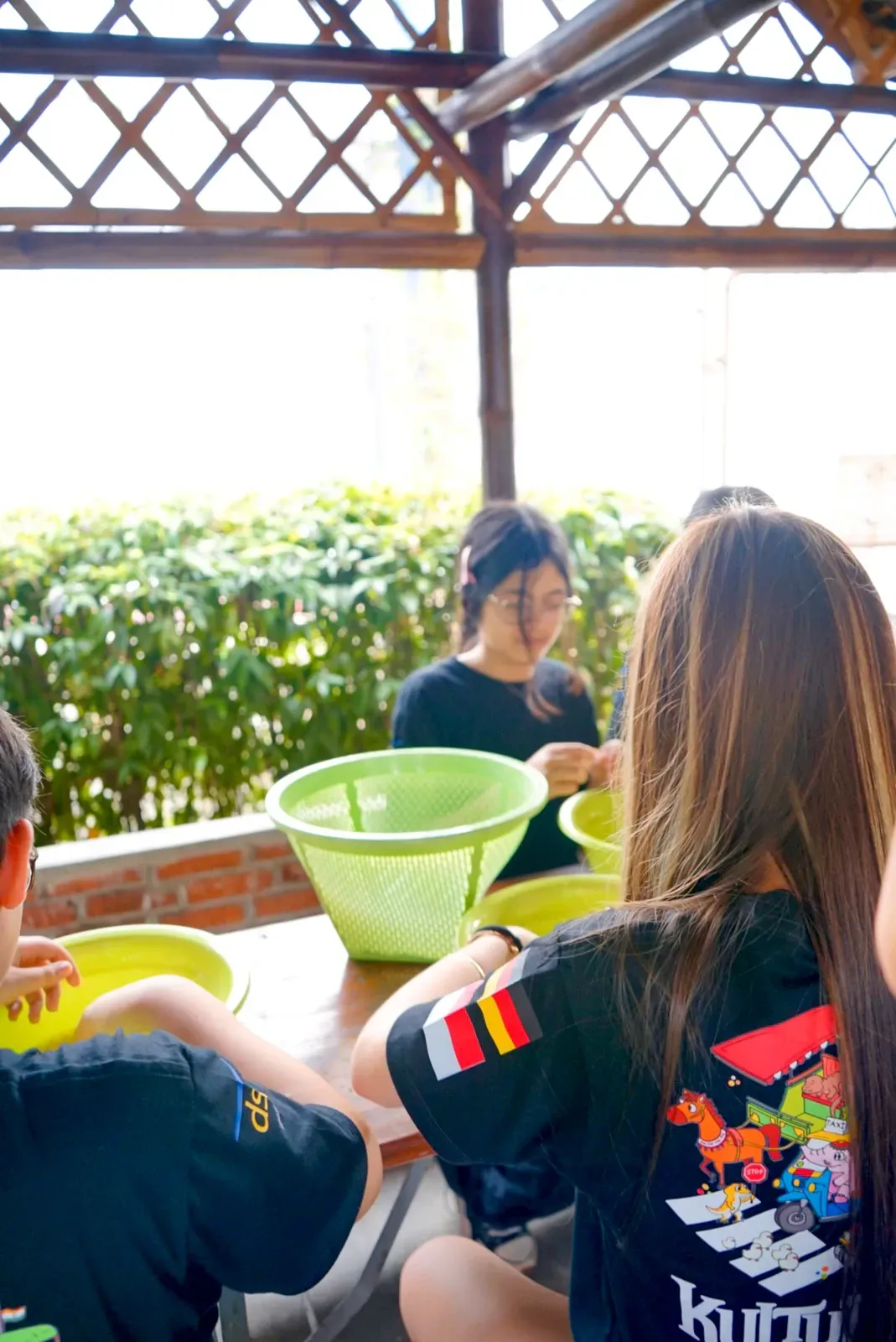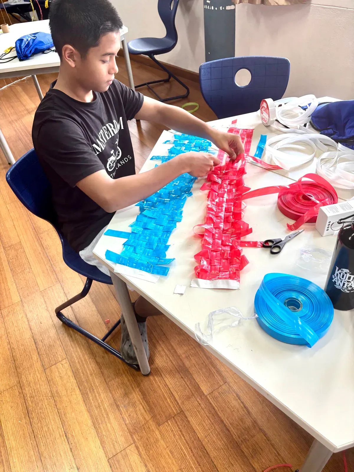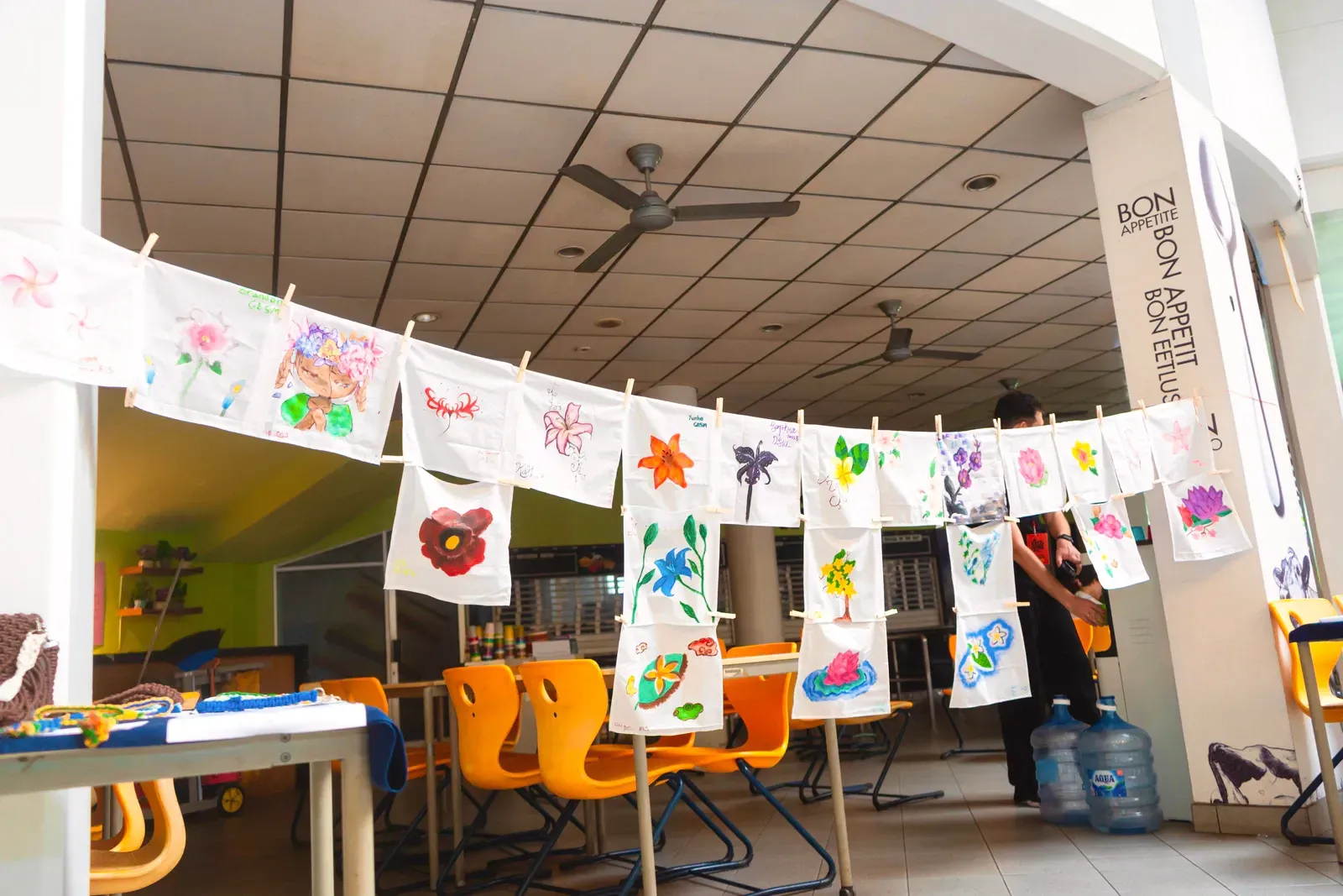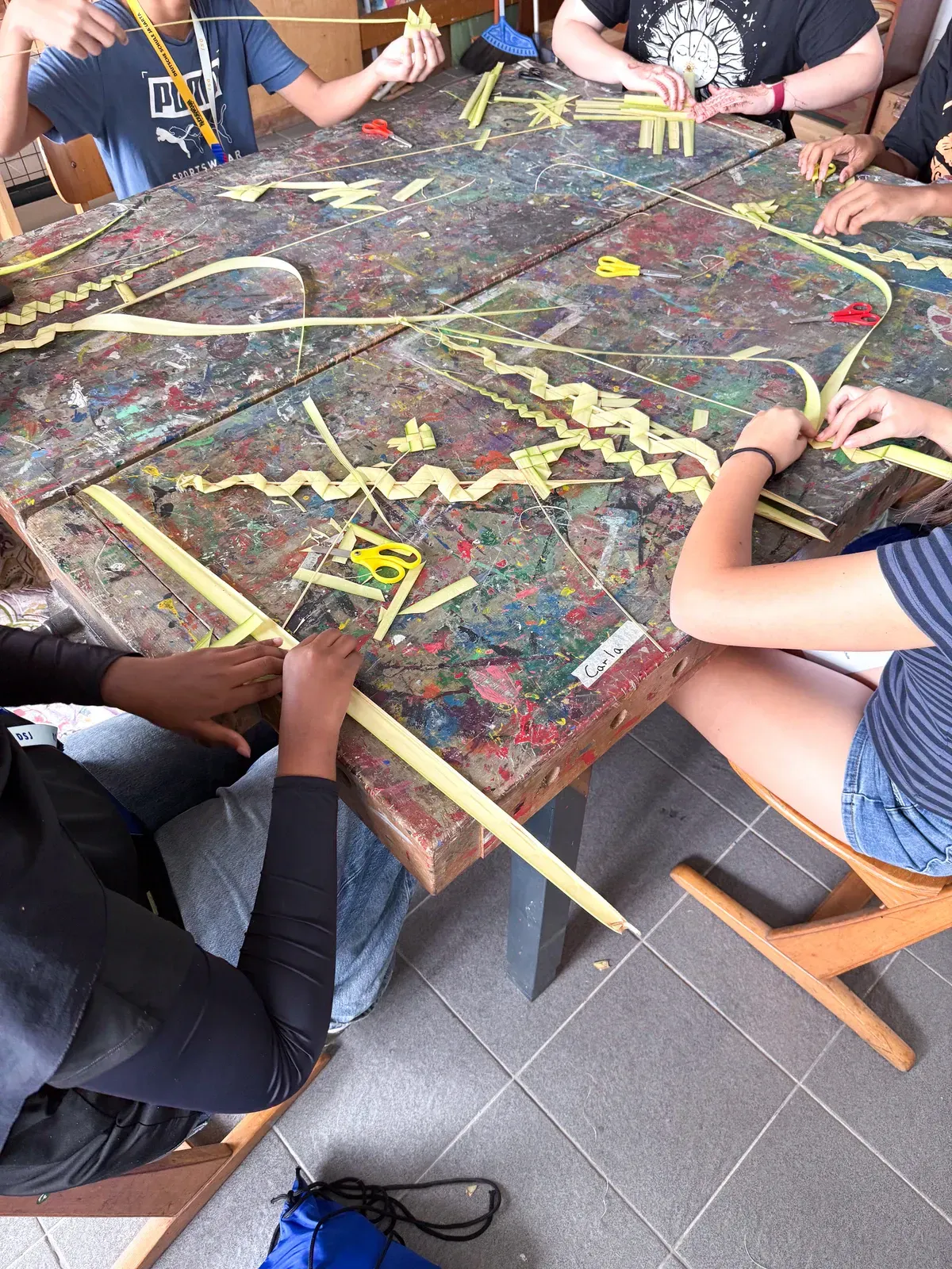 Nachdem die finalen Workshops abgeschlossen waren, verlagerte sich der Fokus darauf, die Aula und das Foyer in einen Ausstellungsraum zu verwandeln, der die Ergebnisse der vergangenen Tage präsentiert. Schülerinnen und Schüler sowie Lehrkräfte brachten den Raum zum Leben und stellten ihre Arbeiten vor – von filigranen Web- und Faltarbeiten bis hin zu experimentellen Projekten wie Kunst mit Tempeh und Camera-Obscura-Installationen, die jeweils Kreativität, Prozess und lokale Kulturen widerspiegelten. Natürliche Materialien wie Bambus und Rattan schufen dabei in vielen Arbeiten eine starke regionale Verbindung. Die Ausstellung wurde durch einen geführten Rundgang eröffnet, geleitet von unserer DSJ-Kunstlehrerin Chiara Giardi, die mit den Teams ins Gespräch kam und Einblicke in die Ideen und Techniken hinter ihren Arbeiten gab.