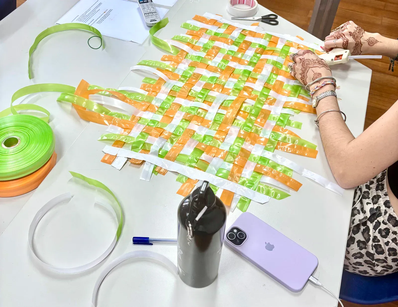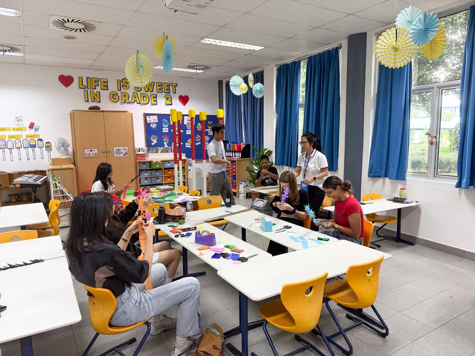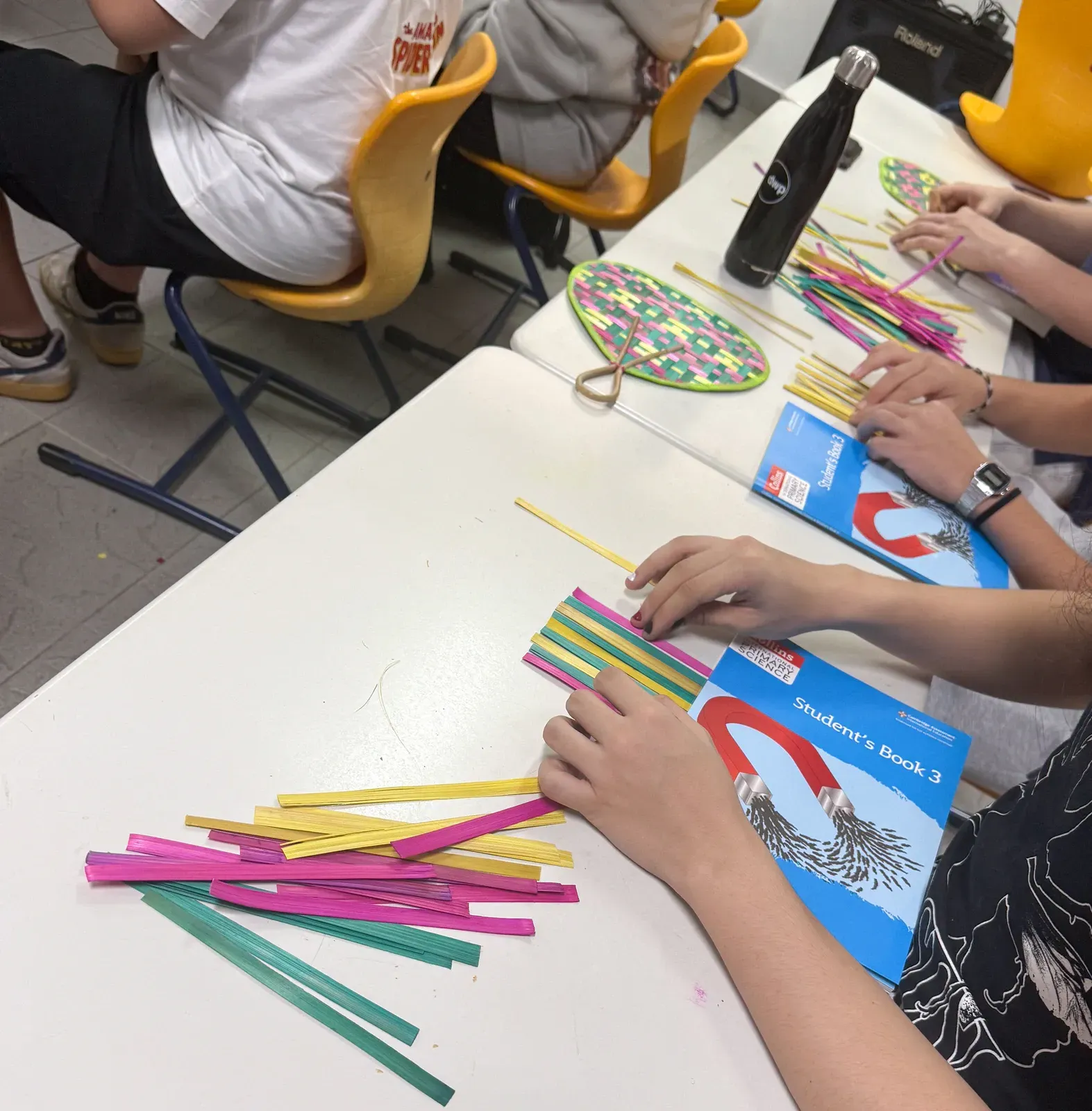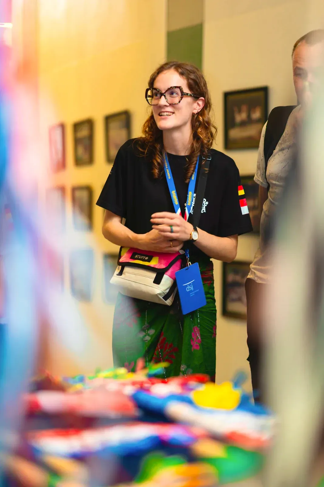 Nachdem die finalen Workshops abgeschlossen waren, verlagerte sich der Fokus darauf, die Aula und das Foyer in einen Ausstellungsraum zu verwandeln, der die Ergebnisse der vergangenen Tage präsentiert. Schülerinnen und Schüler sowie Lehrkräfte brachten den Raum zum Leben und stellten ihre Arbeiten vor – von filigranen Web- und Faltarbeiten bis hin zu experimentellen Projekten wie Kunst mit Tempeh und Camera-Obscura-Installationen, die jeweils Kreativität, Prozess und lokale Kulturen widerspiegelten. Natürliche Materialien wie Bambus und Rattan schufen dabei in vielen Arbeiten eine starke regionale Verbindung. Die Ausstellung wurde durch einen geführten Rundgang eröffnet, geleitet von unserer DSJ-Kunstlehrerin Chiara Giardi, die mit den Teams ins Gespräch kam und Einblicke in die Ideen und Techniken hinter ihren Arbeiten gab.