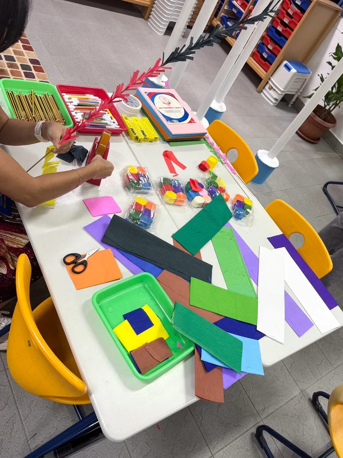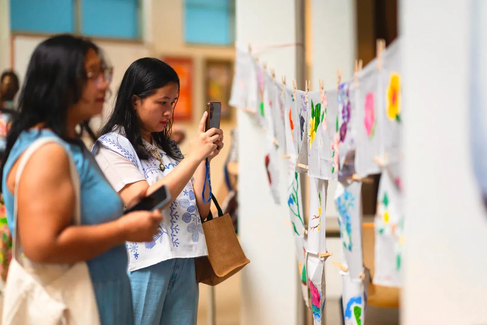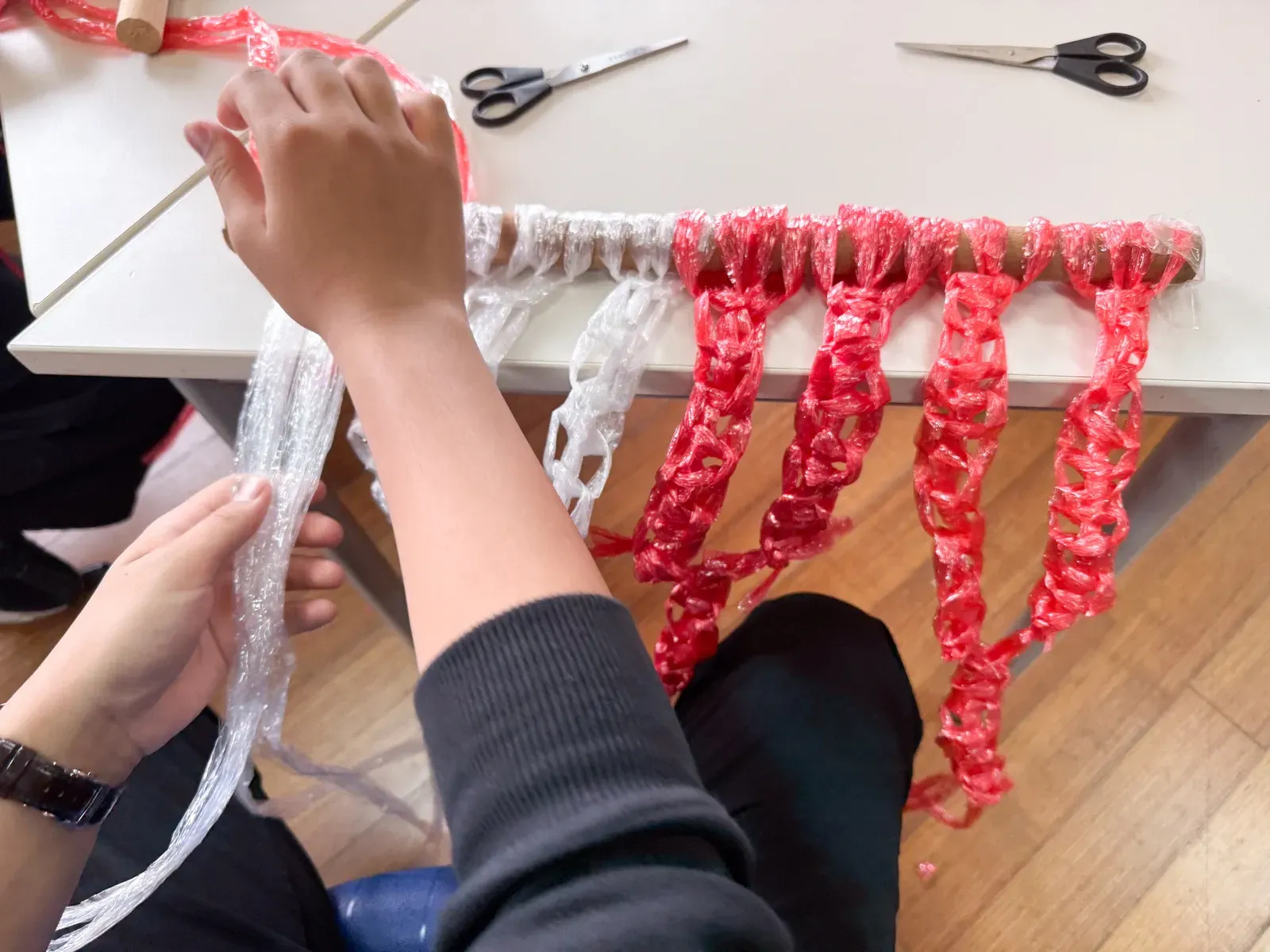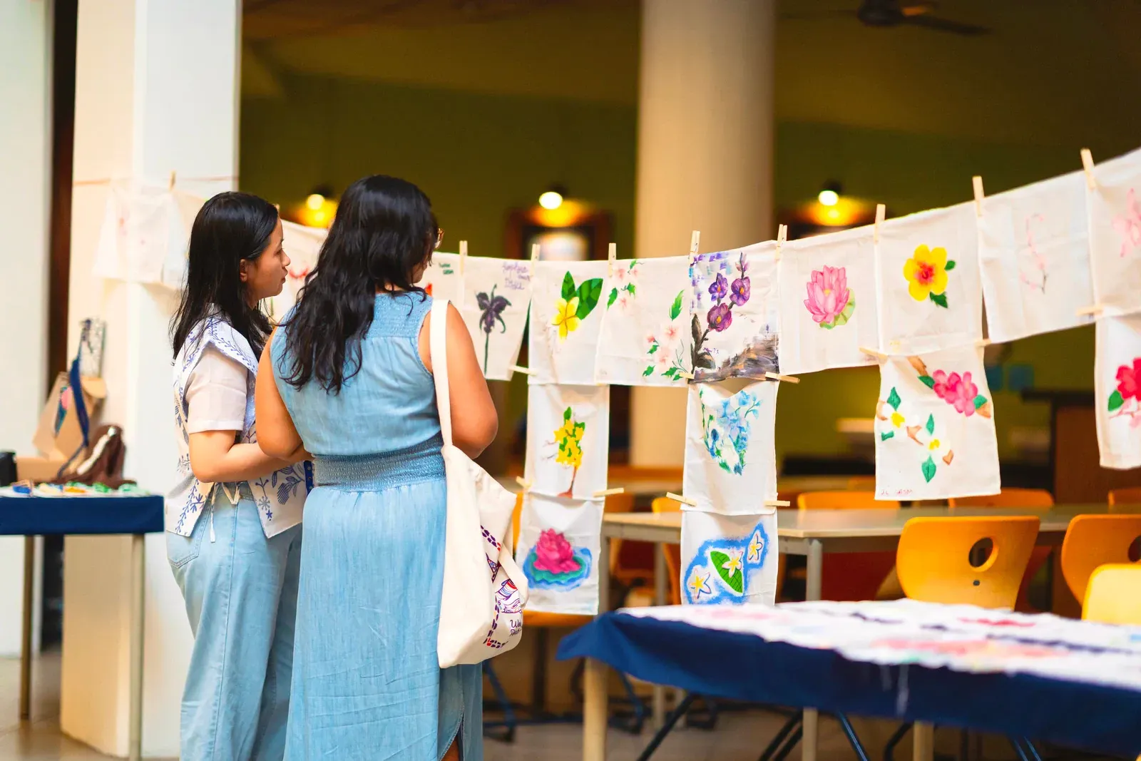 Nachdem die finalen Workshops abgeschlossen waren, verlagerte sich der Fokus darauf, die Aula und das Foyer in einen Ausstellungsraum zu verwandeln, der die Ergebnisse der vergangenen Tage präsentiert. Schülerinnen und Schüler sowie Lehrkräfte brachten den Raum zum Leben und stellten ihre Arbeiten vor – von filigranen Web- und Faltarbeiten bis hin zu experimentellen Projekten wie Kunst mit Tempeh und Camera-Obscura-Installationen, die jeweils Kreativität, Prozess und lokale Kulturen widerspiegelten. Natürliche Materialien wie Bambus und Rattan schufen dabei in vielen Arbeiten eine starke regionale Verbindung. Die Ausstellung wurde durch einen geführten Rundgang eröffnet, geleitet von unserer DSJ-Kunstlehrerin Chiara Giardi, die mit den Teams ins Gespräch kam und Einblicke in die Ideen und Techniken hinter ihren Arbeiten gab.